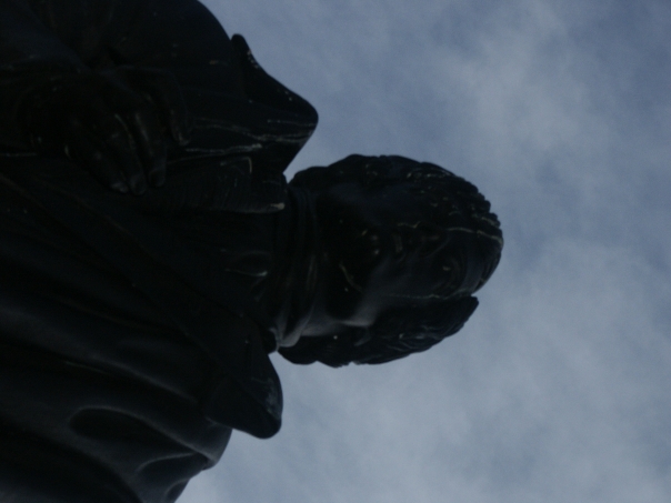 A dark photo of a statue where the identity of the person can't be made out.