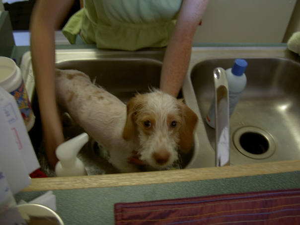 Butter Scotch loathed his bath time, but his legs at last kept him from successfully escaping.