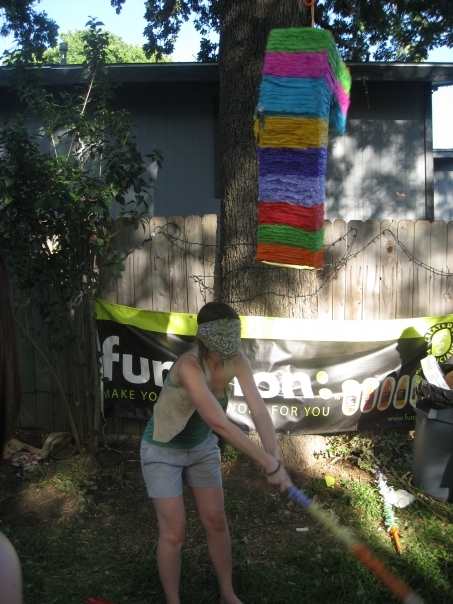 A young girl, wearing shorts, in a bandana blindfold is trying to hit a brightly colored striped rectangular pinata on a sunny day. There's a banner hanging on the back fence.