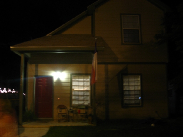 As you near the small frame house with chairs on front porch, the bright light on porch leads to the front door.
