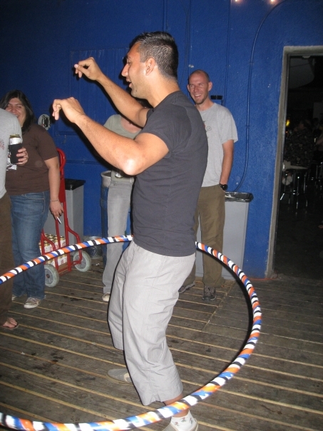 Showing a man entertaining people on a party, with a hoop around his waist.