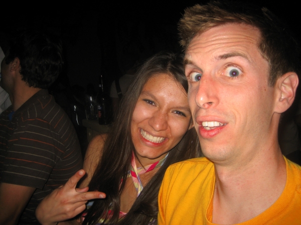 A man with blue eyes looking very surprised or chicked as a woman next to him leans into his shoulder and flashes the 'peace' symbol with her right hand.
