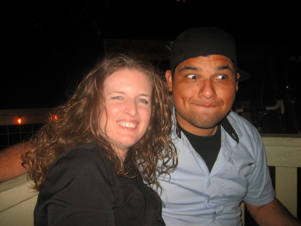 This is a goofy picture of a man and a woman at night