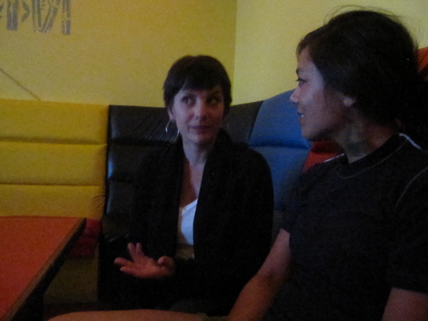 two ladies is siting and talking to each other and one is wearing black coat and other is wearing black t-shirt.