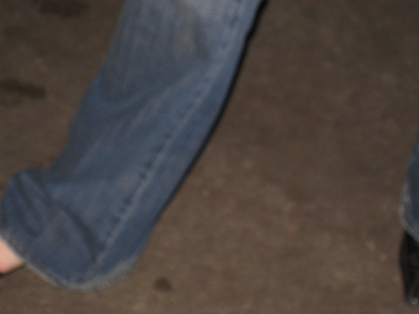 Blurry photo of a person's stone washed jeans against a concrete surface.
