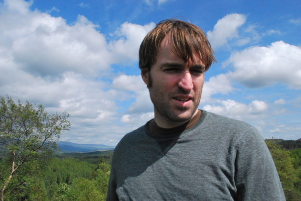 A landscape with rolling hills and lush green plants can be seen behind a man in a gray t-shirt.