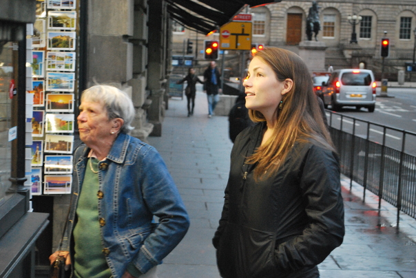 On a cool evening, an elderly woman and a younger woman enjoy looking into a window display.