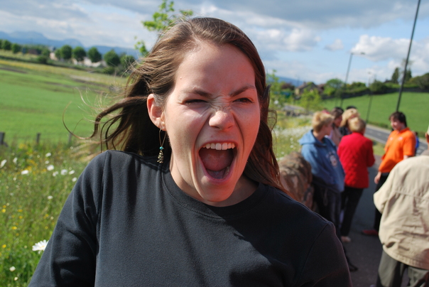 a lady standing outdoors wearing a black sweat shirt is screaming