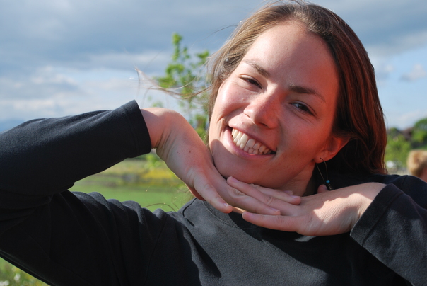 A young woman in a black shirt holds her hands below her chin and smiles.
