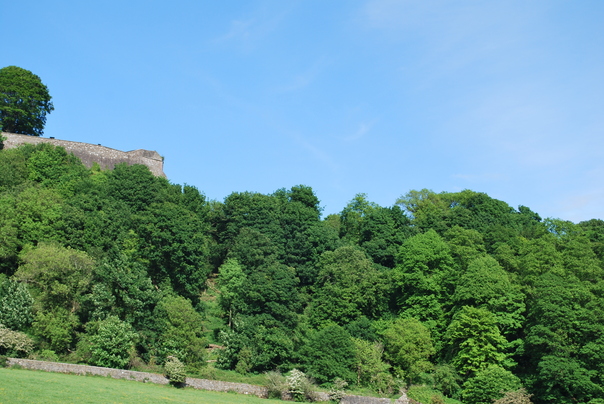 The top of castle rises over lush, green trees and the edge of a field in daylight.