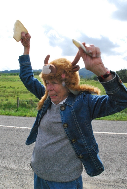 An older woman wearing a blue jean jacket over a gray sweater in a fluffy brown hat with antlers on it has her arms raised in the air holding a piece of bread in each hand standing on the road with a green pasture behind her.