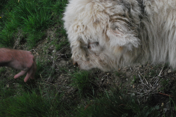 The white mopped looking dog look for a bone with his master.