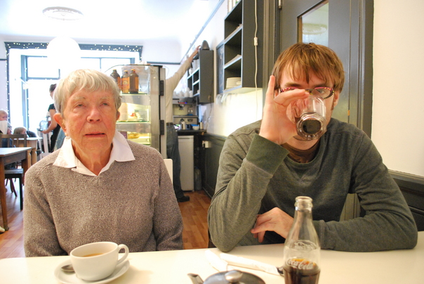 The grandmother is having a cup of coffee at a diner with her grandson.