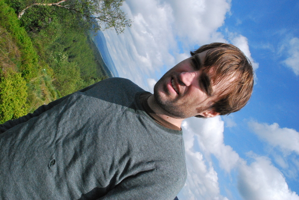 This man is standing outside in a green field with billowy white clouds surrounding him, with the sunshine reflecting off his pale face.
