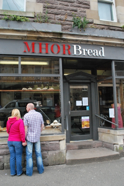 A MHOR Bread entrance with a couple holding hands looking inside of the shop.