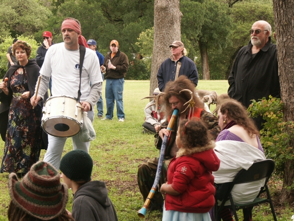 Hippies! Playing music in the park, drummer in a red bandana, while people sit around.
