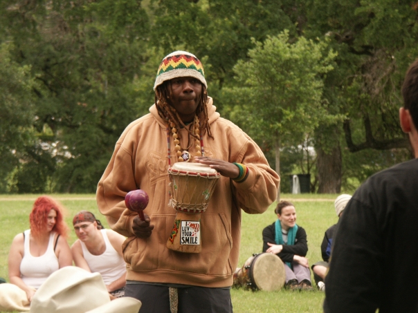 A rasatafarian man with a drum around his neck looking at a man in a black sweatshirt