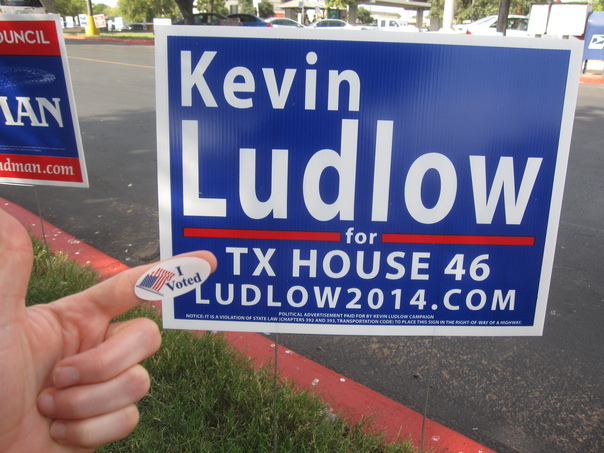 A hand with finger with a I voted sticker on it and pointing to Kevin Ludlow campaign sign. |