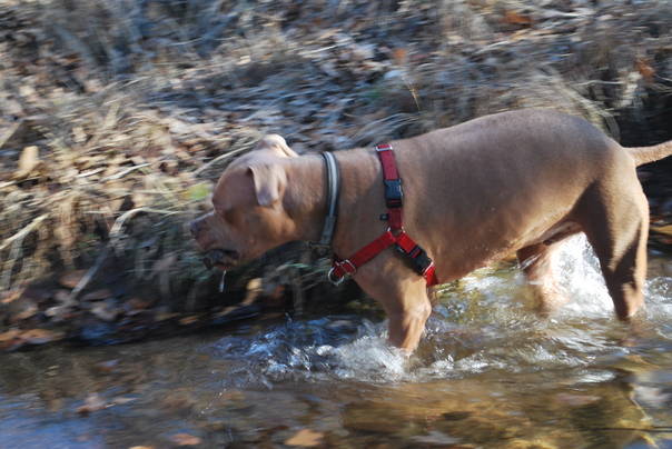 The Dog standing in a water and bitting the wood.