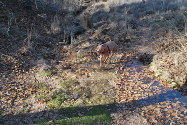 The dog is brown in color and is running outside in the leaves.