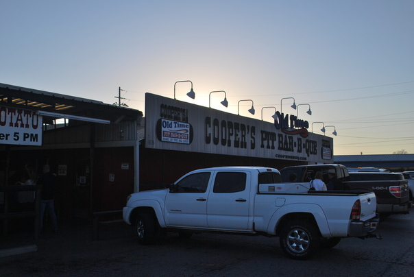 Several trucks are parked in front of a barbeque restaurant.