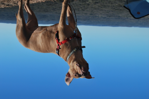 This upside down picture shows a medium sized short haired dog with a blue collar and red harness looking attentive while standing on a beach.