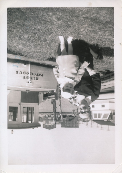 A very nice family picture taken in front of a boat that says min by patchogue. |