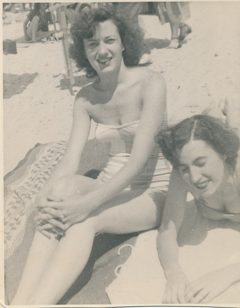 Two ladies taking sun bath one is sitting on the sand and the other one is lying down |