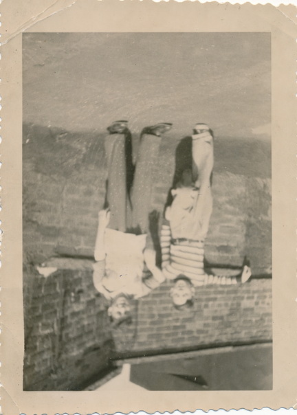 Two young boys dressed in 1950s era clothing are leaning on a brick wall. |