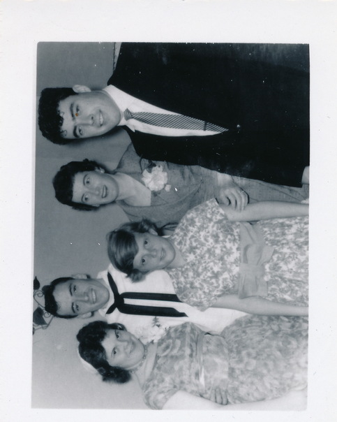 There are five people two guys and tree girls black and white photo of an happy family |