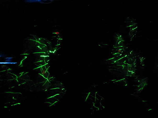There are bright neon green squiggly lines with a pitch black background, also a small object glowing blue. |