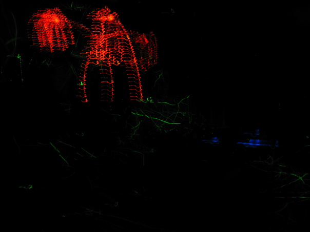 A red, green and blue laser light show in the pitch black. |