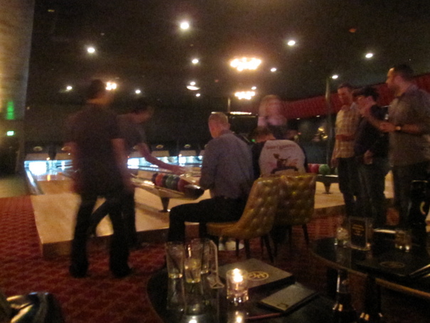 men and woman are in the club and a man wearing full sleeve shirt is playing snow bowling game. |