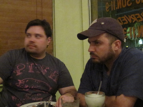 two mans are drinking and eating |