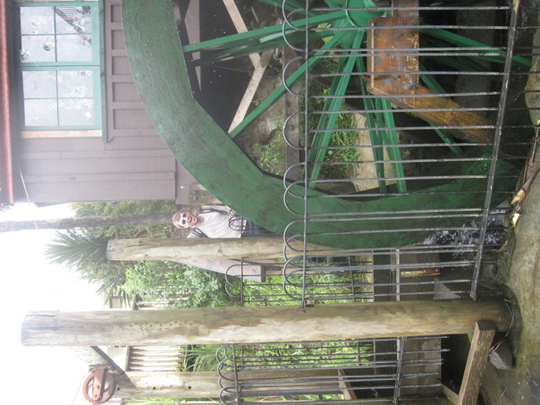 The young man is taking a picture by the old farm equipment outside. |
