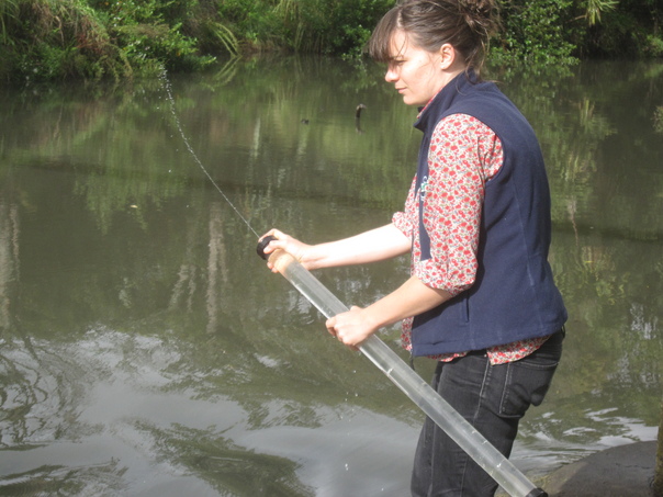 A woman in fishermans gear with some equipment, spraying water into a river. |