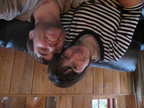 A woman wearing a striped shirt sits next to a man in front of a wooden wall. |