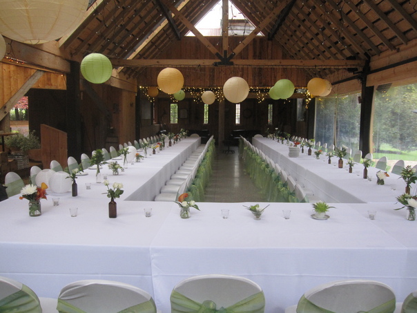 The room holds a large table set for a banquet and decorated with small vases of flowers and balloons in a color scheme of soft greens and ochres. |