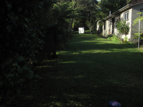 A backyard view with green grass, lots of shrubs and plants and a clothes line with one white towel hanging on it. |