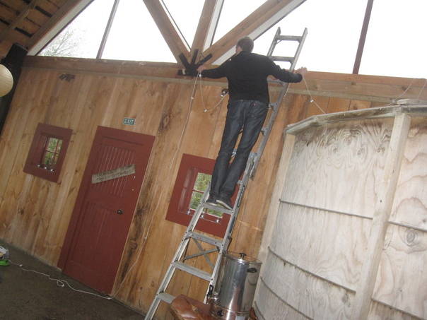 A man is on a ladder hanging a string of lights in a building. |
