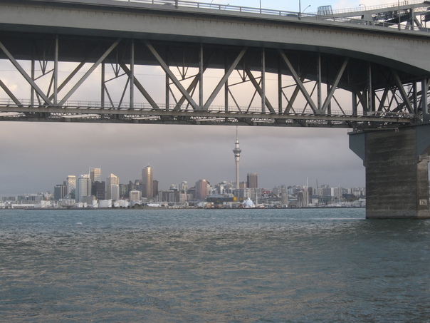 A view of a city from the murky gray waters under a gray concrete bridge. |