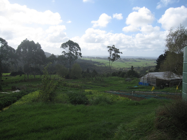 Lush, green hills of a farm stretching away into the distance. |