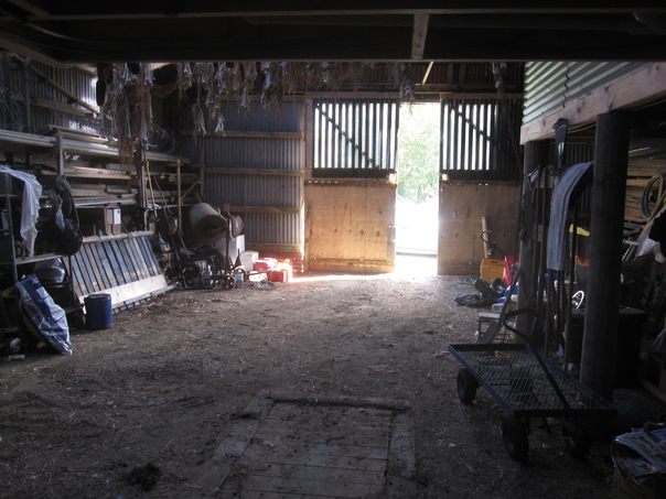 The door to the barn is open and a small light is shining through the door of the barn |