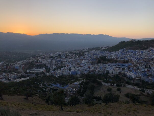 It's called this because most of the houses are painted a light shade of blue, perhaps more of a periwinkle, and so in the evening sun and from the mountains, the entire town kind of glows in a beautiful blue color.