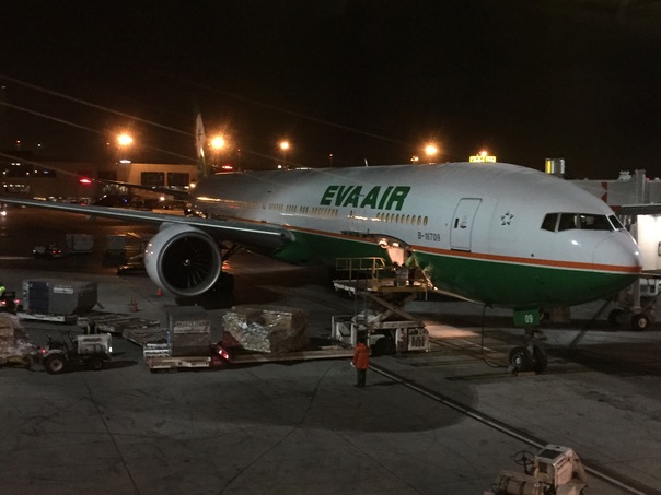 there is a huge green and white airplane sitting on a tarmac with a worker standing in front of one of its jet looking at pallets