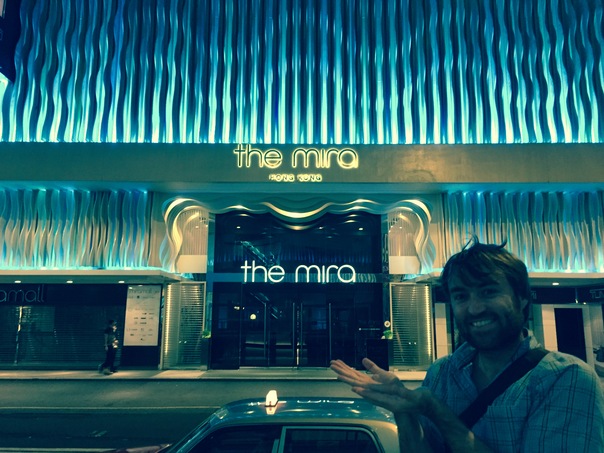 A man smiling outside of a fancy building called the mira.