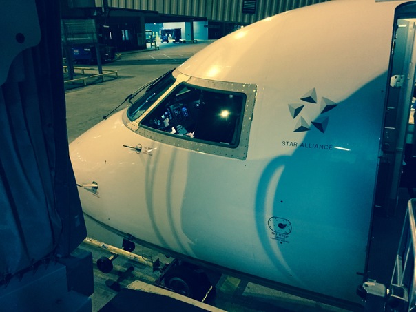 The Star Alliance plan gets ready to taxi away from the terminal to fly in the night sky.