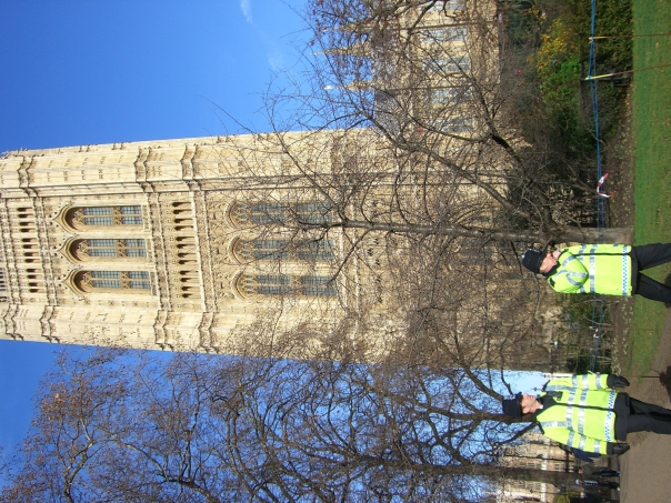Two law enforcement offers wearing bright yellow reflective coats walk past a bare tree and a tall stone tower.