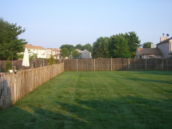 A lush green treeless lawn surrounded by an unpainted or naturally stained wooden fence