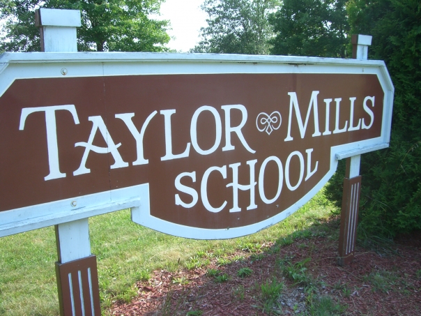 A brown sign with white lettering that reads "Taylor Mills School" in the grass in front of some trees on a sunny day.